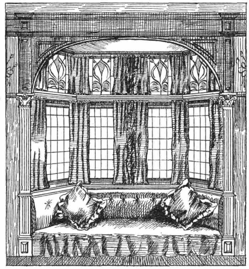deal with, and these, unless we are much overlooked, should have one set of stout material curtains only. As a rule these windows are{116} divided into two parts, the top filled in with stained glass and immovable, the second plain glass and opening either straight out or straight into the room. The rods for the material curtains should come below the stained glass, and each curtain should be placed to go down the wooden part of the window frame only, and each small curtain should be drawn to keep out the sun as required. If muslin must be had in addition to the material, it must, should the window open out or into the room, be fluted on a couple of rods, which are placed top and bottom of the window itself. But if the window open outwards frilled muslin curtains can be arranged on rods on the window frames, to remain in place whether the window is open or shut, an arrangement which is imperative should neighbours be close, or at anyrate, if we are provided with ‘Caldecott’ windows in our bedrooms. I do not advise a window-seat unless we have two windows, because no one should ever sit in the dining-room unless it is positively necessary to do so, and, moreover, it is well to use the space for a writing-table and chair in any but a really large{117} house, and that is a place about which I am not writing at this moment. Here can the husband devote some of his time to household matters and letters of friendship when he is at home, while if there is no third room the mistress can use the desk in the day-time, albeit I trust she may have her own in the drawing-room, that is, if she cannot utilise some upstairs room, although under no circumstances can I advise the stuffy and stupid muddle of so-called ‘boudoir bedroom.’