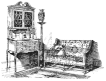 Of course, if we are in the heavenly position of having no old furniture, and can set to work with a free hand, and sufficient money to enjoy ourselves, we can at once do just as we like. But no! even then we have to consider the special room and how best to circumvent its idiosyncrasies. As a rule the door is on the same side as the fire-place, or else exactly opposite it, and we may have recesses on each side of the fire-place, or we may have only an expanse of straight wall beyond the door, and not a recess in the whole place. This latter is the worse fate of the two. The recesses can always be filled either with the charming buffets made both by Smee & Cobay, and Wallace, or by colourable copies of the same without backs, made to fit the recesses, which I do not advise, save in cases where money is a great object: then and then only such an arrangement could be allowed. The shelves could be on brackets and the wall behind hidden by little sateen curtains, sateen curtains replacing the doors in the cupboard part. These shelves could{120}