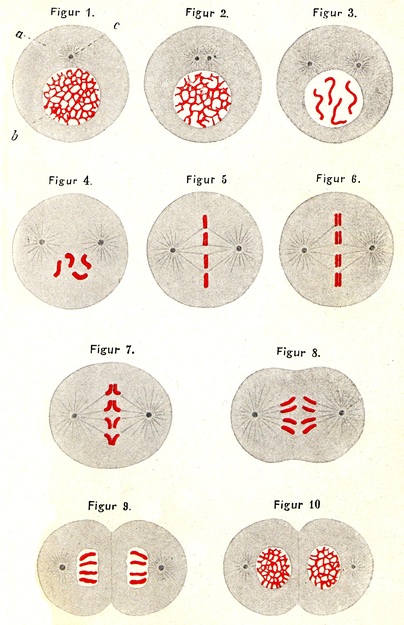 Fig. 1. Ruhende Zelle; a) Zelleib oder Protoplasma; b) ruhender Kern mit Chromatingerüste, Kernhaut und Kernsaft; c) Zentralkörperchen oder Centrosoma. — Fig. 2. Zweiteilung des Centrosomas; beginnende Chromosomenbildung. — Fig. 3. Die beiden Tochter-Centrosomen rücken gegen die Pole und umgeben sich mit Strahlenhöfen; das ganze Chromatin in (4) Chromosomen vereinigt. — Fig. 4. Fortschreiten der beiden Vorgänge; Auflösung der Kernhaut, Aufsaugung des Kernsaftes. — Fig. 5. Anordnung der Chromosomen in der sog. Äquatorialplatte; fädige Verbindungen mit den Centrosomen. — Fig. 6. Längsteilung aller Chromosomen. — Fig. 7 und 8. Wanderung der Tochter-Chromosomen zu den Polen: beginnende Teilung des Zelleibes. — Fig. 9. Die Zweiteilung der Zelle vollzogen: Neubildung von Kernhaut und Kernsaft um jede Chromosomengruppe. Schwinden der Strahlenhöfe um die Centrosomen. — Fig. 10. Übergang beider Tochterzellen in die Ruheform; Auswachsen der Chromosomen zum Chromatingerüste.]