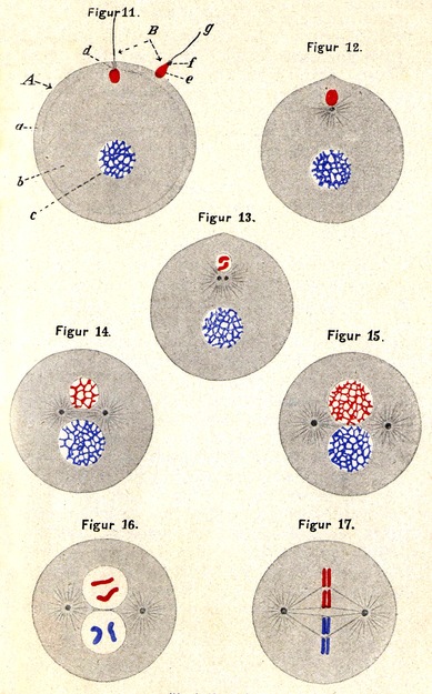 Für uns ist vor allem wichtig die Umwandlung des ruhenden Kernes in die Chromosomen, die Halbierung der Chromosomen und die sorgfältige Verteilung der Hälften auf die beiden Tochterzellen. Was durch den ganzen Vorgang erreicht wird, ist völlig klar: offenbar wird dadurch das Chromatin, die färbbare Substanz des Kernes, so gleichmäßig als irgend möglich auf die Tochterzellen verteilt. Offenbar ist diese gleichmäßige Verteilung des Chromatins Bedingung dafür, daß die Tochterzellen der Mutterzelle gleich werden.