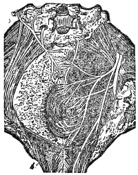 a, Ulcer on sphincter ani. b, Filaments of two nerves are exposed on the ulcer, the one a nerve of sensation, the other of motion, both attached to the spinal marrow, thus constituting an excito-motory apparatus. c, Levator ani. d, Transversus perinei. (Hilton.)