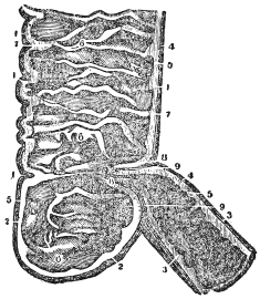 A portion of the wall of the rectum has been removed exposing various layers: 1, serous layer; 2, muscular layers; 3, 3, submucous layers; 4, 4, mucous membrane; 5, internal sphincter muscle; 6, external sphincter muscle; 7, circular muscular bands forming the rectum; 8, rectum; 9, sigmoid flexure. (See Fig. 7, showing the longitudinal muscular bands.)