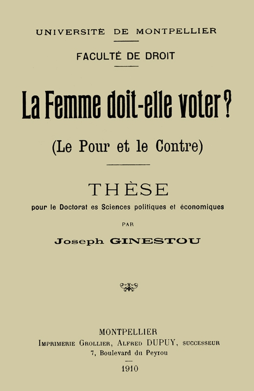 Nous nous bornerons simplement à être les spectateurs de cette lutte nouvelle et de ce pénible travail de désexualisation. Impartialement, nous compterons les coups; nous enregistrerons les défaites sans rancœur, nous soulignerons les victoires avec modestie. Dans cette thèse, nous examinerons de prime abord l’acteur principal de la question: «la femme». Nous donnerons ensuite les raisons qui militent en faveur de leur plaidoyer pour l’obtention des droits politiques; malgré toute notre galanterie, nous exposerons enfin celles qui leur sont défavorables.