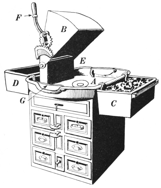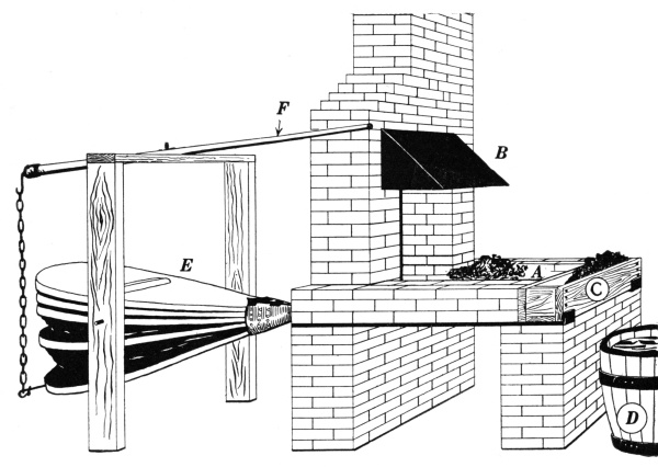 Suspended on the upper edge surrounding the hearth, and located to the right and left of the operator, two boxes C and D are located, which are used for storing an adequate supply of coal and water, where they may be conveniently obtained.