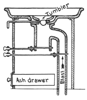 In front are two handles; the upper one operates the clinker or ash valve, the lower one regulates the blast.