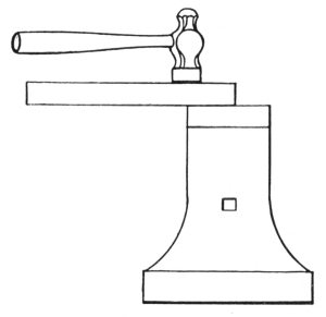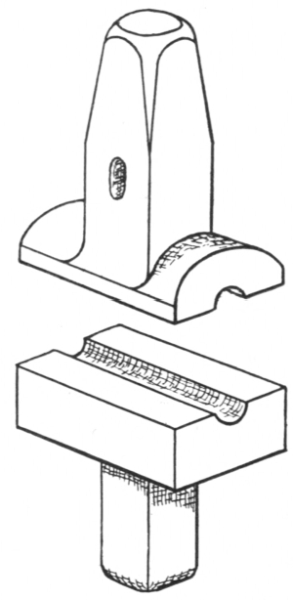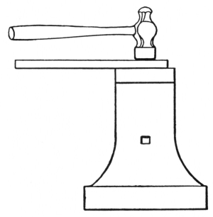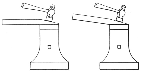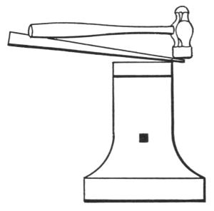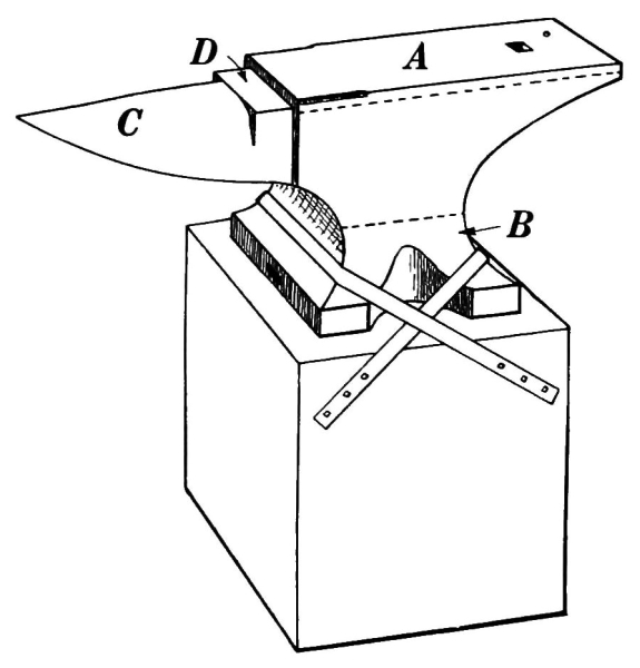 The anvil is usually mounted on a wooden block and is securely held by bands of iron as shown in the illustration, or it may be fastened by iron pins driven around the concave sides of the base. It is sometimes mounted on a cast-iron base made with a projecting flange which holds the anvil in place.