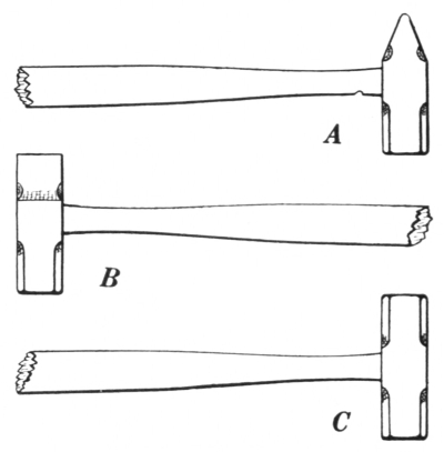 A, ball peen hammer; B, cross peen hammer; C, straight peen