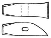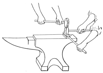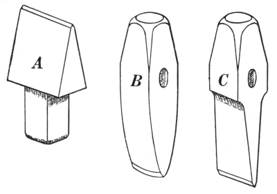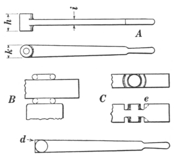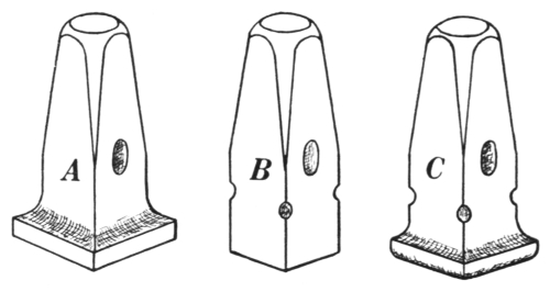 9. The sledges (A, B, and C, Fig. 7) are used for striking on cutters, swages, fullers, or other top tools; when they are used by the helper, the blacksmith can be assisted in rapidly drawing out metal. The only difference between these two sledges is in the peen—one is crosswise with the eye and the other lengthwise. The double-faced sledge C is sometimes called a swing sledge, because it is used mostly for a full swing blow.