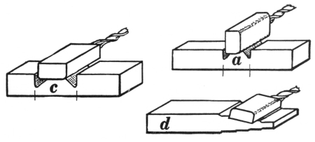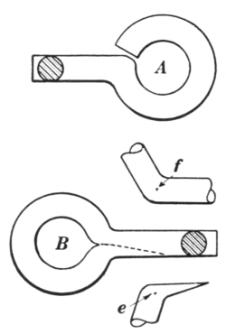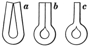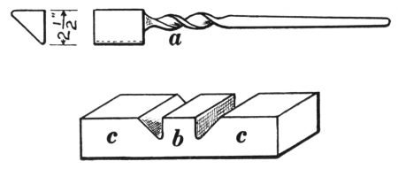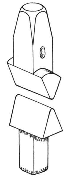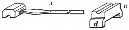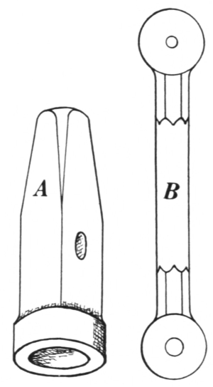 12. The hollow bit tongs, shown at B, Fig. 8, are very handy for holding round iron or octagonal steel. They can be used also for holding square material, in which case the depressions in the jaws should be V-shaped.