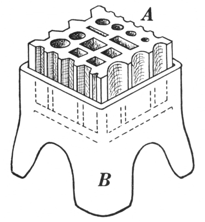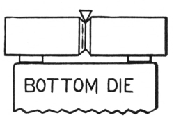 Anvils are made of wrought iron or a special quality of cast iron. In the latter case the face is sometimes chilled to harden it, or is made of steel which is secured to the base when the anvil is cast. Those that are made of wrought6 iron are composed of three pieces: the first is the base B which is forged to the required dimensions; the second is the top which includes the horn C and the heel; the third is the face A of tool steel which is welded to the top at the place shown by the upper broken line. The top and base are then welded together at the lower broken line.