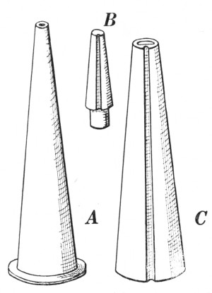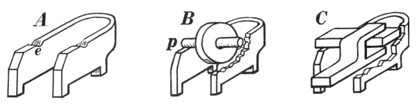 A, flat-jawed tongs; B, hollow bit tongs; C, pick-up tongs;