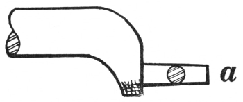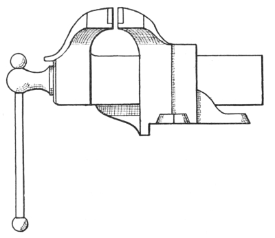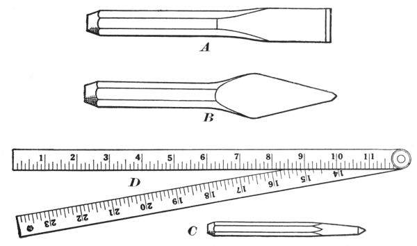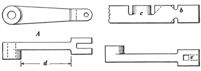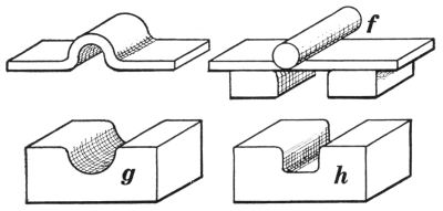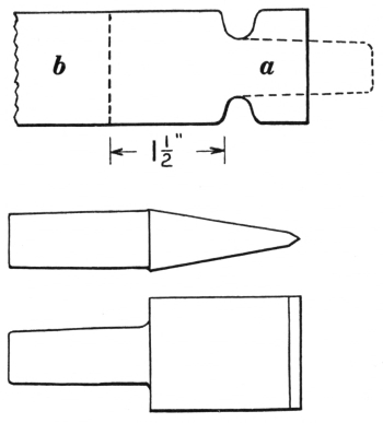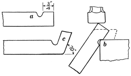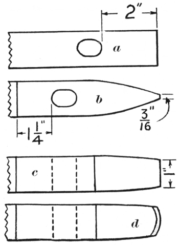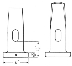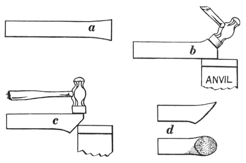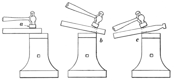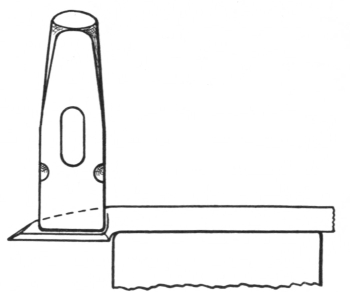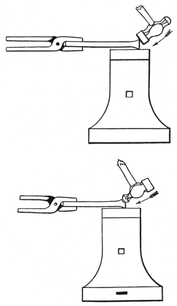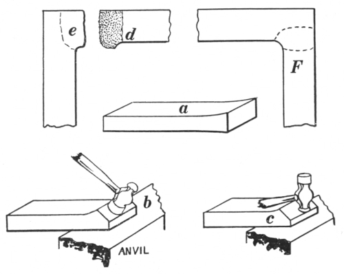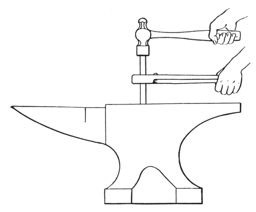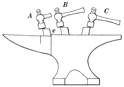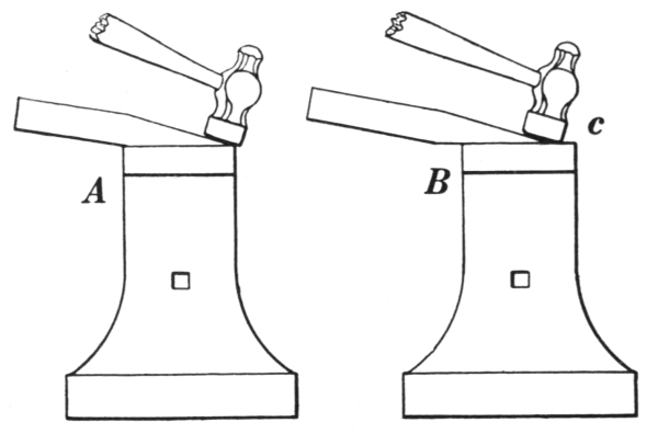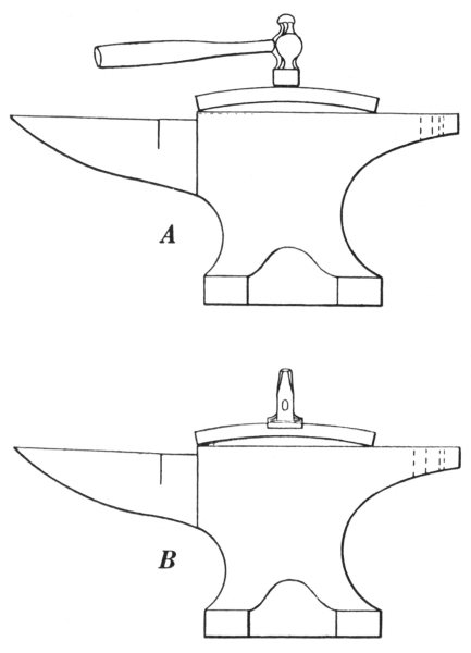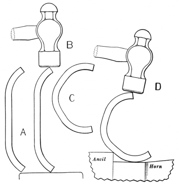 6. The ball peen hammer (A, Fig. 6), sometimes called a machinist’s hammer, is very conveniently shaped for forging, as the ball end is handy for drawing out points of scarfs or smoothing concave surfaces. A suitable weight of this kind of hammer is one and a half pounds, but lighter ones can be used to good advantage for fastening small rivets.