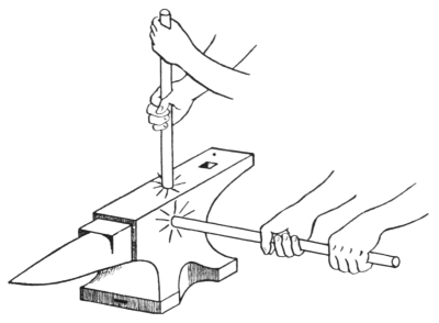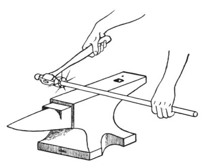 Chapter I. Tools and Appliances.—1. The Forge; 2. Fire Tools; 3. Fuels; 4. The Anvil; 5. The Hammers; 6. The ball peen hammer; 7. The cross peen hammer; 8. The straight peen hammer; 9. The sledges; 10. The Tongs; 11. The flat-jawed tongs; 12. The hollow bit tongs; 13. The pick-up tongs; 14. The side tongs; 15. The chisel tongs; 16. The link tongs; 17. The tool or box tongs; 18. Anvil and Forging Tools; 19. The hardy; 20. The cold and hot cutters; 21. The hot cutter; 22. The flatter; 23. The square- and round-edged set hammers; 24. The punches; 25. The top and bottom swages; 26. The top and bottom fullers; 27. The button head set or snap; 28. The heading tool; 29. The swage block; 30. The surface plate; 31. The tapered mandrels; 32. Bench and Measuring Tools; 33. The bench or box vise; 34. The chisels; 35. The center punch; 36. The rule; 37. The dividers; 38. The calipers; 39. The scriber or scratch awl; 40. The square; 41. The bevel; 42. The hack saw; 43. The files |