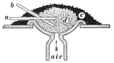 The coal box C is to the right, where it is convenient. The coal should always be dampened with water to prevent2 the fire from spreading. This will produce a more intense and more concentrated heat, so that a certain part of the metal can be heated without danger of affecting the rest.