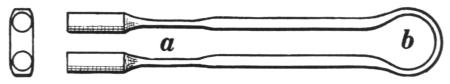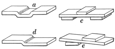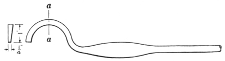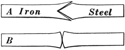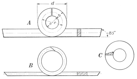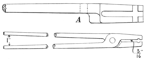 11. The flat-jawed tongs are shown at A, Fig. 8. They are made in various sizes to hold different thicknesses of material. Tongs of this kind hold the work more securely if there is a groove lengthwise on the inside of the jaw; the full length of the jaw always should grip the iron.