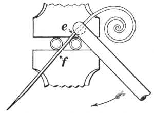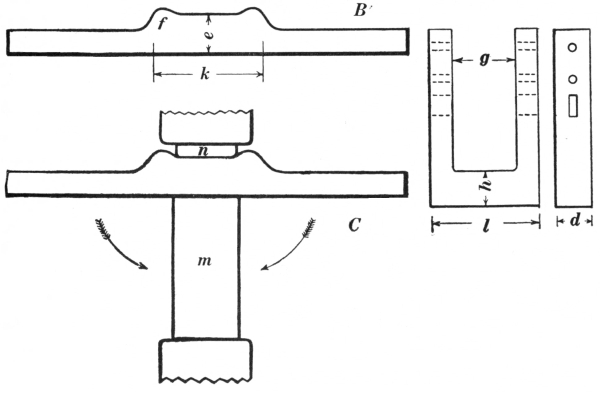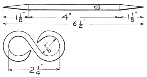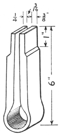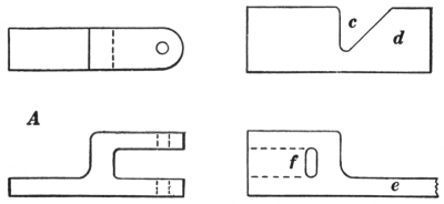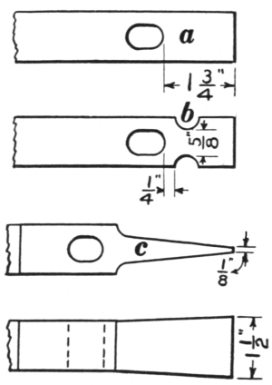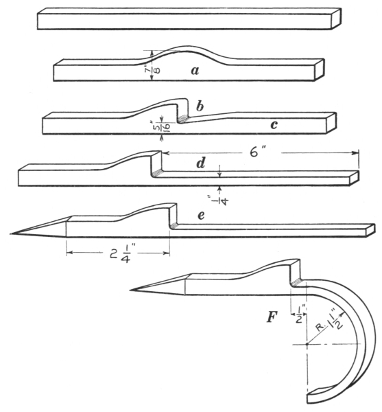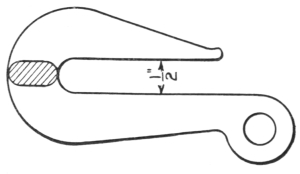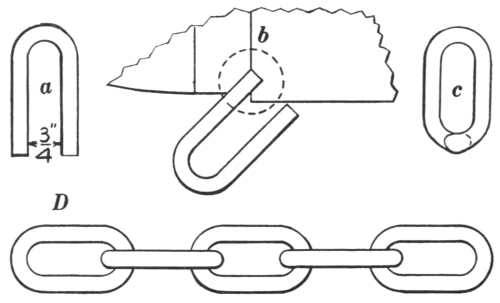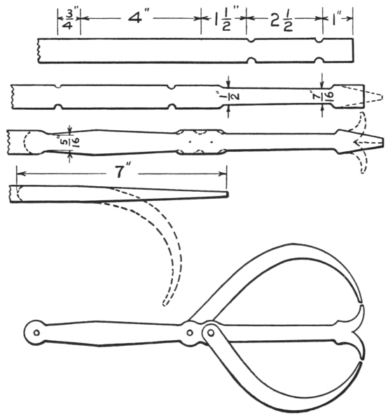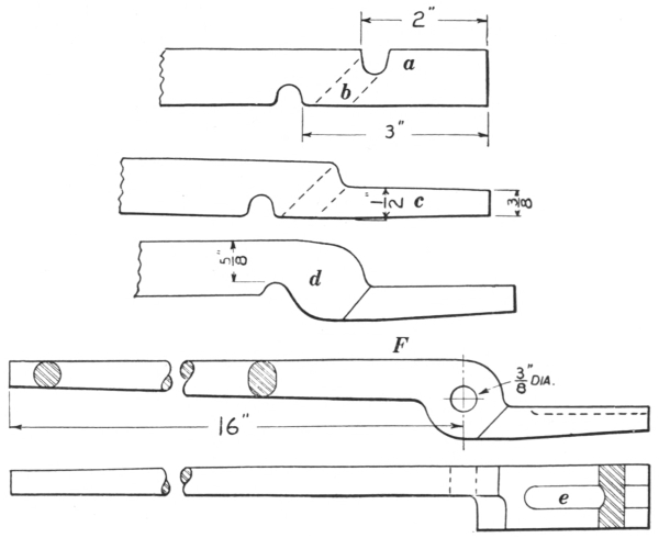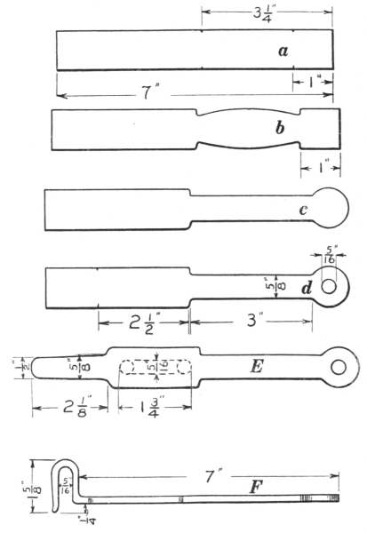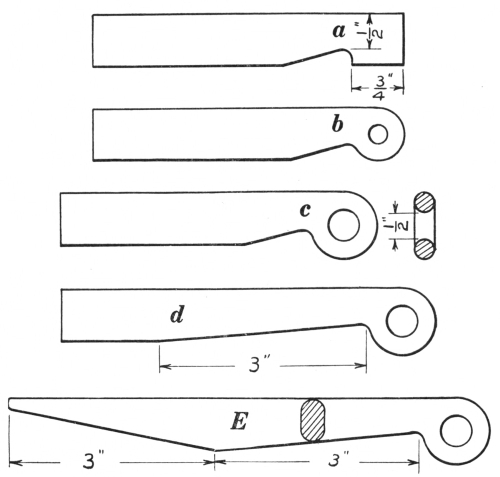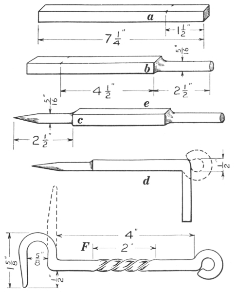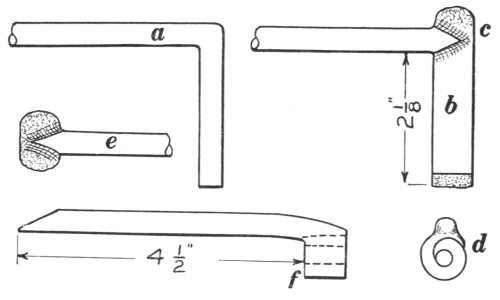 16. The link tongs (F, Fig. 8) are as essential as anything else required in making chains or rings of round material. They can be made to fit any size of stock.