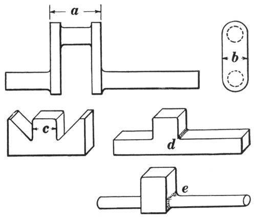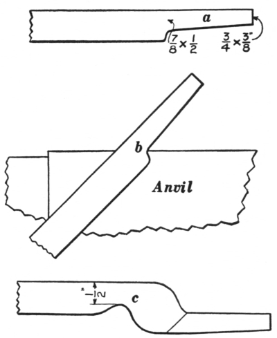 Chapter VI. Steam Hammer, Tools, and Exercises.—112. A Forging; 113. The Drop Hammer; 114. Presses; 115. The Steam Hammer; 116. Steam Hammer Tools; 117. The hack or cutter; 118. The circular cutter; 119. The trimming chisel; 120. The cold cutter; 121. The checking tool or side fuller; 122. The fuller; 123. The combined spring fullers; 124. The combination fuller and set; 125. The combined top and bottom swages; 126. The top and bottom swages; 127. The bevel or taper tool; 128. The V block; 129. The yoke or saddle; 130. Bolsters or collars; 131. Punches; 132. Steam Hammer Work; 133. Crank Shaft; 134. Connecting Rod; 135. Rod Strap; 136. Eccentric Jaw; 137. Hand Lever; 138. Connecting Lever; 139. Solid Forged Ring; 140. Double and Single Offsets |
