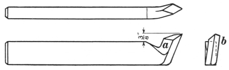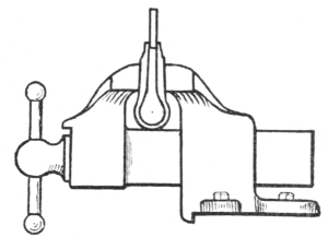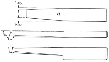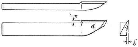17. The tool or box tongs (G, Fig. 8) should be made to fit the various sizes of lathe tool stock that are used. They should be made substantially and fit the steel perfectly so that it can be held securely and without danger of stinging the hand, while the tool is being forged. Another style of tool tongs is made with one jaw perfectly flat; on the other jaw, lugs are provided to hold the steel firmly. These are not illustrated.