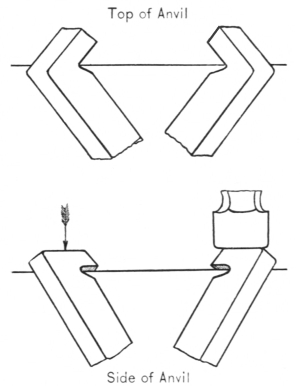 After the anvil has been finished, the face is hardened with a constant flow of water, then it is ground true and smooth and perfectly straight lengthwise, but slightly convex crosswise, and both edges for about four inches toward the horn are ground to a quarter round, thus providing a convenient place for bending right angles. This round edge prevents galling, which is liable to occur in material bent over a perfectly square corner.