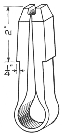 15. The chisel tongs are shown at E, Fig. 8. One or more pairs of these are necessary in all forge shops. As the hot and cold cutters frequently get dull or broken, it will be necessary to draw them out and retemper them; and, as the heads of these cutters become battered considerably, they are difficult to hold without chisel tongs. The two projecting lugs at the ends of the jaws fit into the eye, and the circular bows back of them surround the battered head of the cutter, so that it can be held without any difficulty.