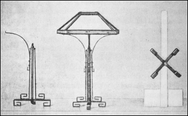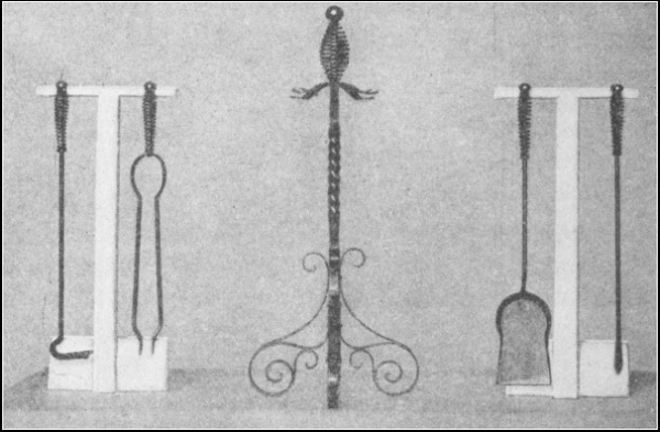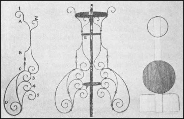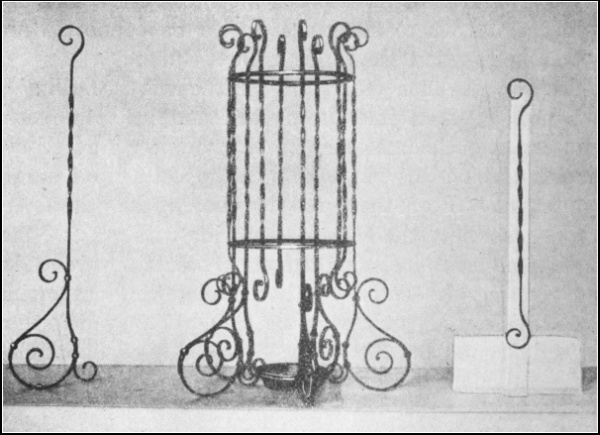 Chapter VII. Art Smithing and Scroll Work.—141. Art Smithing; 142. Scroll Fastenings; 143. Scroll Former; 144. Bending or Twisting Fork; 145. Bending or Twisting Wrench; 146. Clip Former; 147. Clip Holder; 148. Clip Tightener or Clincher; 149. Jardinière Stand or Taboret; 150. Umbrella Stand; 151. Reading Lamp; 152. Andirons and Bar; 153. Fire Set; 154. Fire Set Separated |