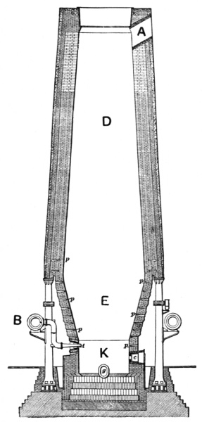 The fire is kindled on the hearth A under the hood and over the tuyère iron. This iron, the terminal of the blast pipe that leads from the bellows E, is made in various forms and of cast iron; sometimes it has a large opening at the bottom, but often it has none.