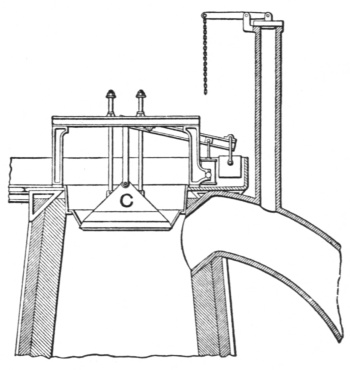 The hood B projects over the fire sufficiently to catch the smoke and convey it to the opening of the down-draft pipe E. When necessary the hood can be raised out of the way with the lever F, which is constructed with cogs and provided with a locking pin to keep the hood in position.