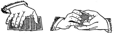 The individual player takes a full pack of fifty-two cards, shuffles and cuts, and deals off three for himself, two for his crib, and then three more for himself. Taking up the six, he sorts them and discards for the crib, just as if the two cards already there had been laid off by an opponent. The pack is then cut for the starter.
