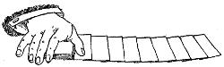 After running through the entire pack, three cards at a time, the cards that have not been used in the process, and which are lying on the table face up, are taken up again and turned face down, without shuffling them, and run through again, three at a time. As long as any card can be used it must alter the run of the cards that will turn up in threes after that, and the player may continue to go through the pack in this way until[695] he is stopped by being unable to use any card that shows at the top of the three he turns up.