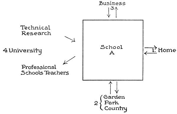 In this second symbolic diagram (II) I wish to suggest that really the only way to unite the parts of the system is to unite each to life. We can get only an artificial unity so long as we confine our gaze to the school system itself. We must look at it as part of the larger whole of social life. This block (A) in the center represents the school system as a whole. (1) At one side we have the 89home, and the two arrows represent the free interplay of influences, materials, and ideas between the home life and that of the school. (2) Below we have the relation to the natural environment, the great field of geography in the widest sense. The school building has about it a natural environment. It ought to be in a garden, and the children from the garden would be led on to surrounding fields, and then into the wider country, with all its facts and forces. (3) Above is represented business life, and the necessity for free play between the school and the needs and forces of industry. (4) On the other side is the university proper, with its various phases, its laboratories, its resources in the way of libraries, museums, and professional schools.