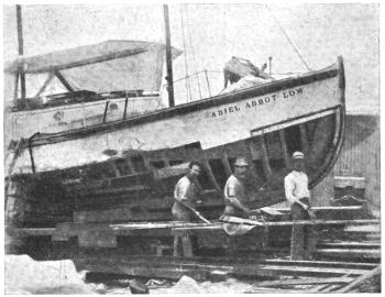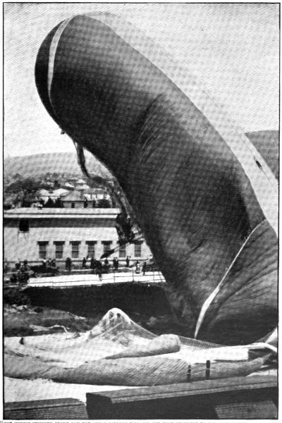 The unfortunate men were entangled in the wreckage of flapping cloth, network, and machinery, running the danger of being struck by the propellers of the engines or of being suffocated by the great volumes of escaping gas. One valve-tender, who was on the top of the great bag, can be seen in one of the photographs climbing along the netting. His agility stood him in good stead, for he escaped from the wreck almost uninjured.