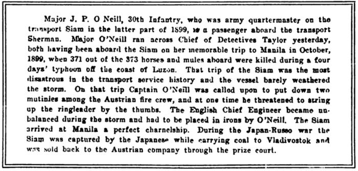 The Siam had just returned from Nanaimo with a cargo of coal. She was a fine, big, ten-knot boat, with Austrian officers and sailors. The War Department decided, although she flew the flag of the Emperor Joseph, that she was just the vessel needed. Early in August, after several weeks of hammering, sawing, and building of superstructures, three hundred and seventy-three horses and mules were sent aboard and placed in separate stalls for the long voyage to Manila. The loading of the animal cargo was a matter of much concern to the War Department, with the result that almost the pick of the packers and teamsters of the army—fifty-six in all—were chosen for the voyage.