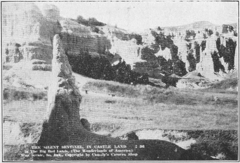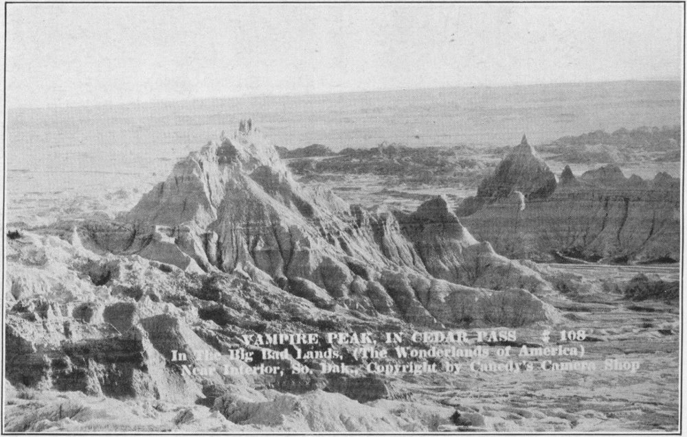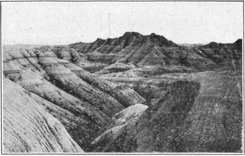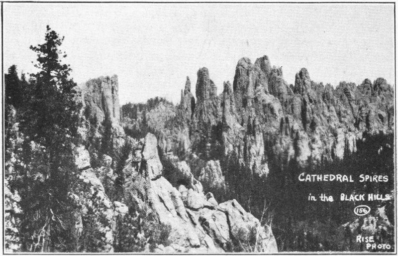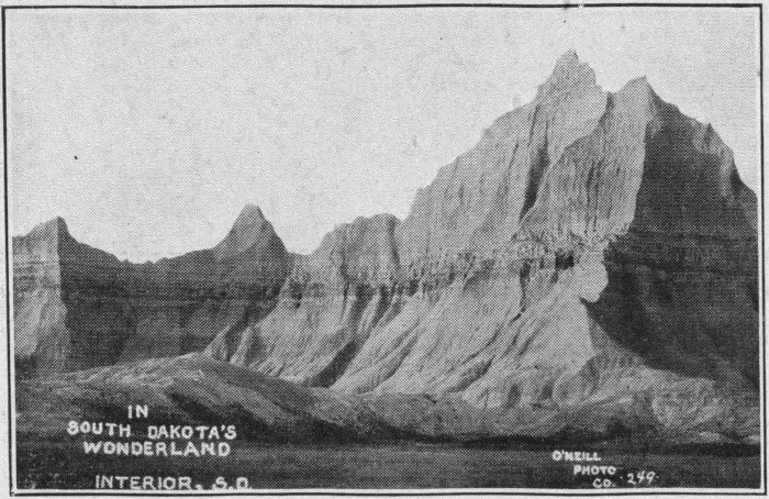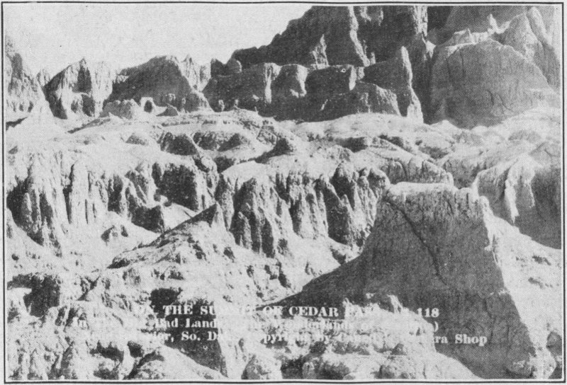 No attempt will be made in this volume at a systematic cataloging of the various things of interest to be seen. The account will be strictly chronological, in order, just as it was experienced on a trip through the “Hills.” Preceding the Black Hills accounts will come an account of a tour through the Great Badlands of South Dakota. A trip to the “Hills” is not complete without a visit to the Badlands, and the impressiveness of the latter is scarcely less than that of its neighbor. It is well to plan for this part of the trip before entering the “Hills.” Then, if it rains the Badlands must be postponed until the close, for the roads are somewhat bad when wet.