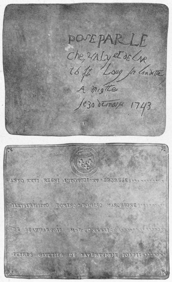 The Verendrye Plate, found on the bluffs above Fort Pierre, February 16, 1913. It was buried by La Verendrye, March 30, 1743, when he was exploring the land for France. This is the first evidence of white men in South Dakota.