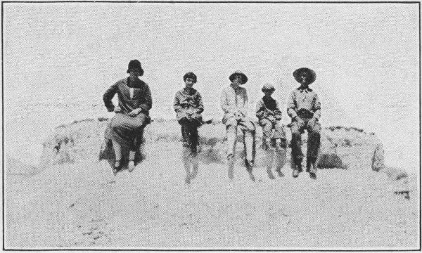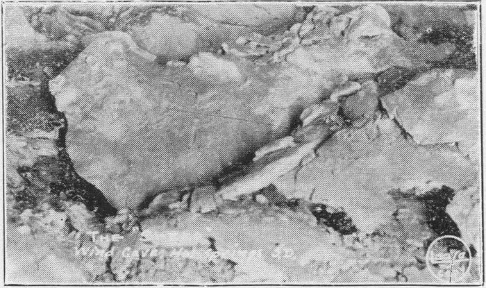 We descend the south slope of the ridge, past the new Cedar Pass Camp, and drive five miles or so over a good road into Interior. On the way, however, we stop and walk for some distance among the hills. We find the clay to be hard and firm, resembling baked mud in texture. Each rain washes a little of the clay down, causing a gradual erosion through the years. This process has gradually uncovered the remains of life of this country at the time of its formation. We find a petrified tooth of some great animal. The tooth is about four inches long and two wide. Some distance farther we run across a mammoth rock formation embedded in the clay. It resembles and may have been the remains of a turtle six 26 or seven feet in diameter, with head and feet protruding out of the bank. From these same environs scientists have taken great petrified skeletons of ancient mastodons, reptiles, birds and beasts of all shapes and sizes. We can easily imagine how these beasts got bogged down in this once soft, spongy ex-sea-bottom, there to remain through these centuries.