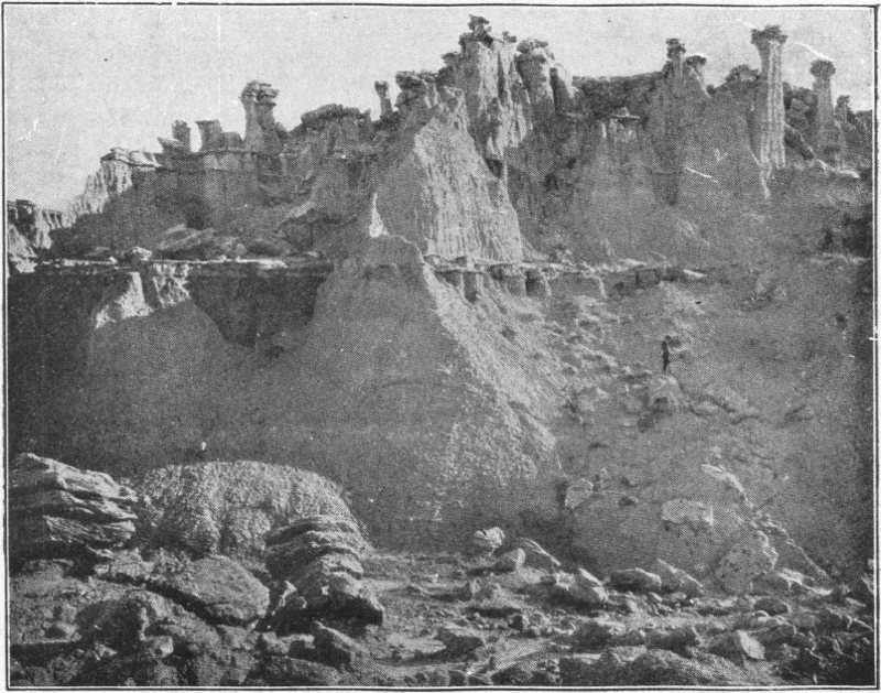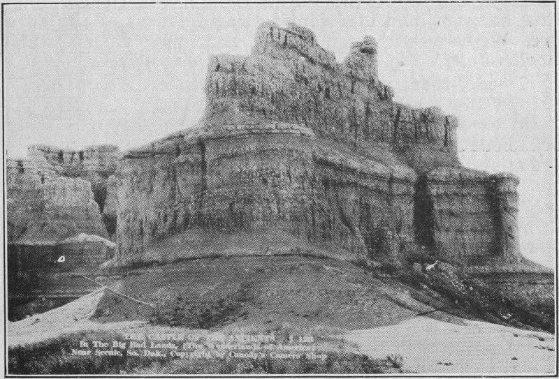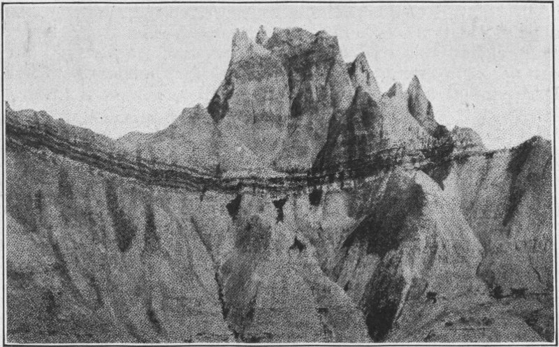 We cross the Missouri River on the morning of June 29th and speed along through comparatively new but highly productive agricultural land, through Hayes, Midland and Philip to Cottonwood. In Philip we find one of the most modern small cities of the state. It is worth stopping to see. When we arrive at Cottonwood, about three hours from Pierre, or a little less than one hundred ten miles, the weather seems favorable and the roads good so we turn south off U. S. highway 14. Only a few miles out of Cottonwood we look ahead and see the city-like elevations far in the distance. As we draw nearer this great wall of clay takes on a more artistic contour of multicolored towers, peaks, and walls, resembling ruins of ancient cities.