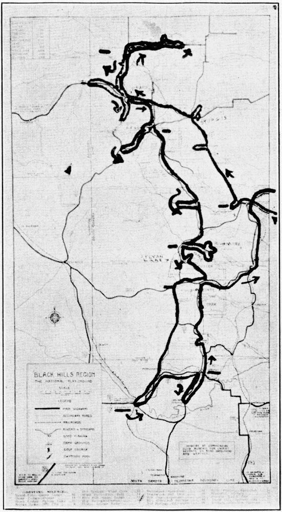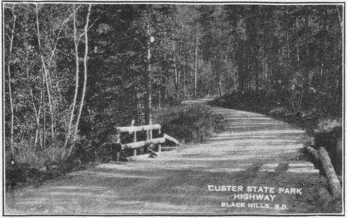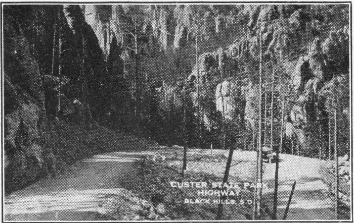 No matter whether the entrance to South Dakota is made from the north, south, east, or west, all of the main roads are gravel surfaced. Many an Eastener will complain of the driving on these roads, but one may drive up to fifty or sixty miles per hour on them with comparative safety, with the average car. This is far beyond the legal limit of the state. Rain and other adverse weather conditions will not affect traveling. This holds true for most of the main highways in the “Hills.”