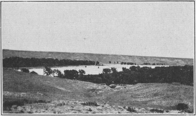 From the Capitol our trip takes us through the city of Pierre over the bridge to Fort Pierre where first evidences of white men in S. D. were found. A high flagpole now stands where the Verendrye Plate, planted in 1743, was found.