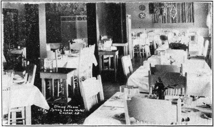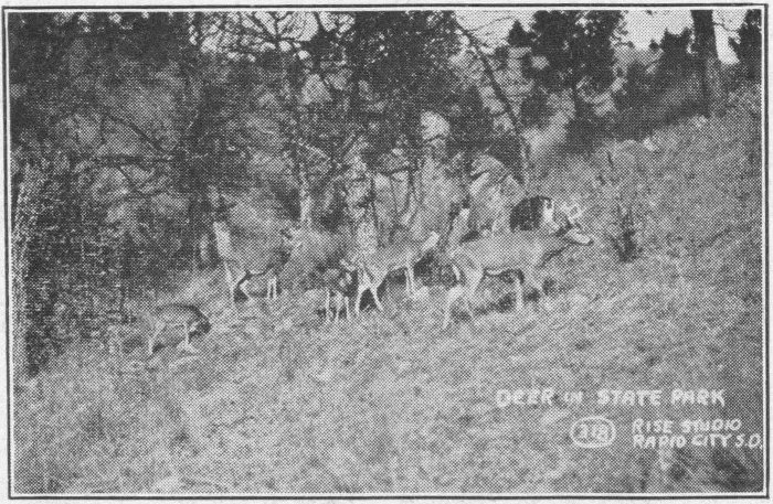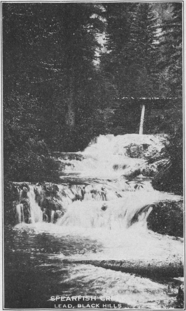 On to Rapid City we drive, over an excellent dirt road. We stop on the Cheyenne River to eat our lunch. These little picnic grounds all help to make the trip a really enjoyable vacation. We must stop at the turn in the road for a drink of Nature’s purest nectar flowing through a huge fountain. This is just a few miles before we reach Rapid City.