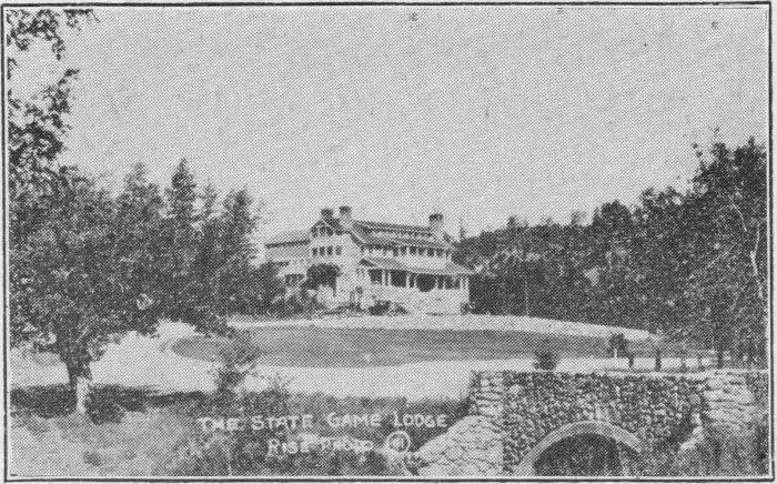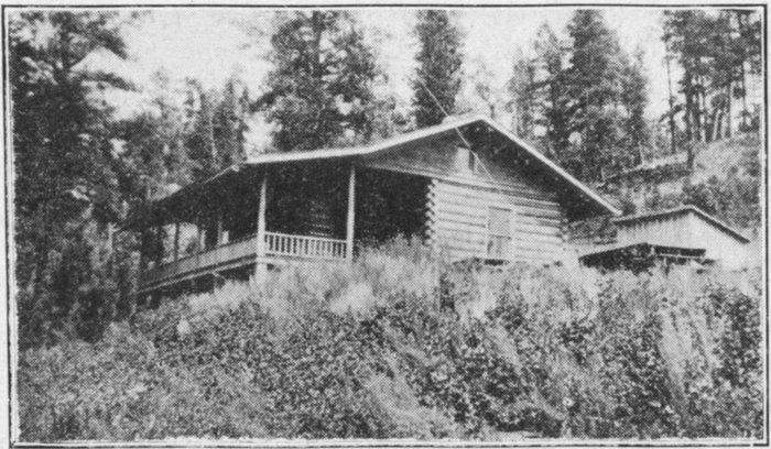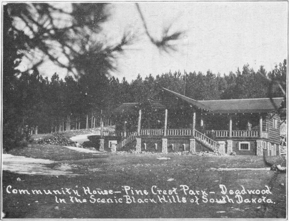 True to the spirit of the Black Hills, Rapid City Municipal Camp has its neat log cabin, with reading table, fireplace, electric lights, and other conveniences for its guests. Tourists are welcomed there at any and all times. These log cabins are a decided thrill to the traveler who is not familiar with them. Later in this account there will be a description of the typical log cabin.