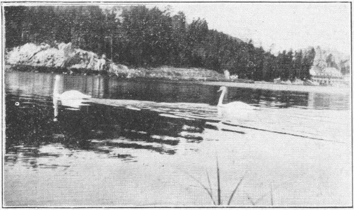 On this placid lake, surrounded by splendid lawn, swans float gracefully and various other aquatic forms feed with varying degrees of industry.