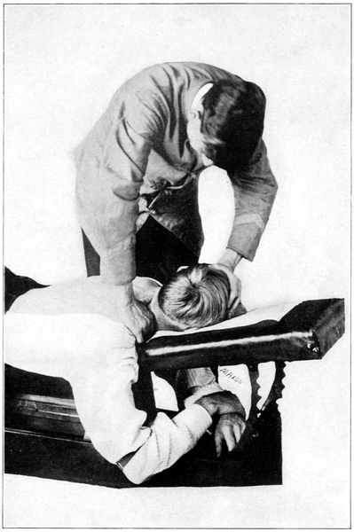 Potts’ Disease.—Tubercular caries of the bodies of the vertebrae is curable, within limits. Occasional cases are seen in which Nature has stopped the spread of the disease by walling off the morbid area with exostosis. Such cases should not be adjusted, and the disease may remain latent through a long life. When active the disease proves fatal unless checked, which is possible in the earlier stages, and becomes impossible when the vertebral bodies are too fragile to stand strong adjustments. Discernment in case-taking will avoid any fatalities under adjustment, but by no means all cases of Potts’ Disease are curable.