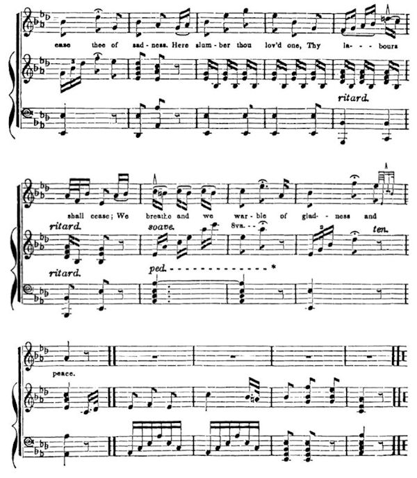The Scotch music, without possessing much claim to art, has a decidedly characteristic feature. It is unlike the compositions of any other country. Even their quickest airs have something peculiarly melancholy in their style, which is touching and agreeable. The principal feature in Scotch music is the frequent introduction of short, catching sounds before long notes.