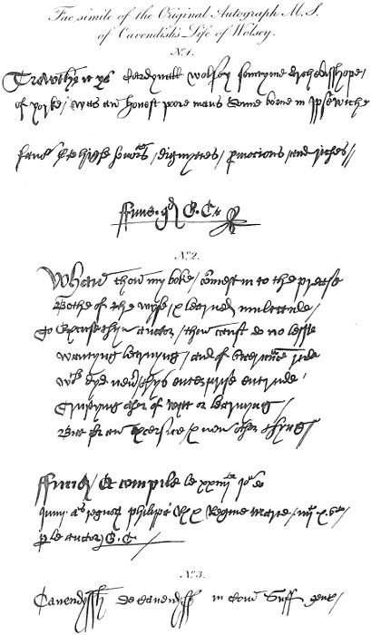 Having purchased two valuable ancient manuscript copies of the work, one of them from among the duplicates of the late Duke of Norfolk’s library[2], I conceived [xiv] that the text might be very much improved by collation of these and the several manuscripts in private and public libraries. Upon naming the design to my friend Mr. Douce, he mentioned to me a very curious copy in the possession of Mr. Lloyd, which contained some verses apparently by the same author, and which from this circumstance might have some claim to be considered the author’s original autograph. Upon application to that gentleman, he, with a liberality which calls for my warmest thanks, immediately placed the manuscript in my hands. I at once saw that its pretensions were undoubted, and that it contained not only a more valuable text of the Life, but a series of poems, evidently in the hand writing of the author, with occasional corrections and interlineations, and thus attested:—“per le Auctor G. C.” in numerous places. [xv]On the first blank leaf is written in the same hand with the body of the manuscript, “Vincit qui patitur qd G. C. Maxima vindicta paciencia;” and then “Cavendysh de Cavendysh in Com. Suff. gent.” and beneath, “I began this booke the 4. day of Novembr.” On the reverse of the same leaf is another Latin sentence and the motto of Cavendish, Cavendo tutus. On a succeeding blank leaf is the name of a former possessor, C. Rossington[3], under which is written in another hand, “i. e. Clement Rossington of Dronfield, Gent. whose son Mr. James Rossington gave me this MS.” It is remarkable that it should have passed [xvi] into the possession of a person in Derbyshire. Those who have made Sir William Cavendish the author would have seized upon this circumstance with avidity as lending colour to their assertion, and would probably have argued that the initials G. C. by which George Cavendish has attested it as his production in so many places, were intended to designate Gulielmus Cavendish. Mr. Hunter has, however, settled the question beyond the possibility of dispute; it is sufficient to remark here that Sir William Cavendish died in 1557, and that this manuscript affords unequivocal evidence that the writer survived Queen Mary, who died at the close of 1558. Unfortunately the first leaf of the text of the Life is wanting. At the end of the Author’s Address to his Book, with which the poems conclude, is the date of the completion of the manuscript, which will be found on the plate of fac-similes:
