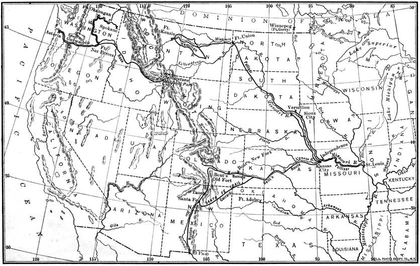 The American Fur Company, established by Mr. Astor, began operations in 1809. One after another, other fur-trading companies were absorbed, until Astor saw himself at the head of all the fur trade south of Canada, with the possible hope of reaching out for the trade of the northern country east of the Rocky Mountains. West of that range was a vast field as yet almost untouched. True, the Russians had trading-posts in what was then Russian America, and sent the furs gathered there direct to China. True, also, that some American coasting vessels on the Pacific secured a few furs which they took to China, but this hardly touched the possibilities of half a continent. Astor clearly saw that, if systematized and carefully managed, this desultory traffic would be enormously profitable, and this led6 him to organize the Pacific Fur Company, the chief station of which was to be at the mouth of the Columbia River. That station might be connected with others on the Atlantic water-shed by a chain of trading-posts across the continent, and such a combination, he believed, would control the whole American fur trade. Furs could be shipped in either direction—down the Missouri, eastward; or to the west, down the Oregon, to go to China.