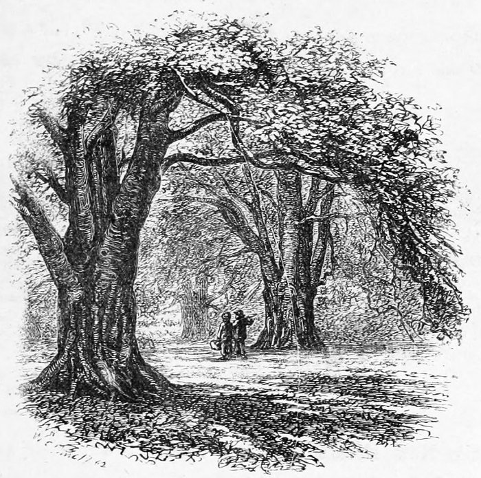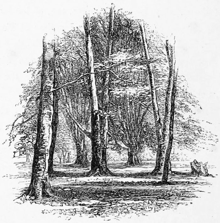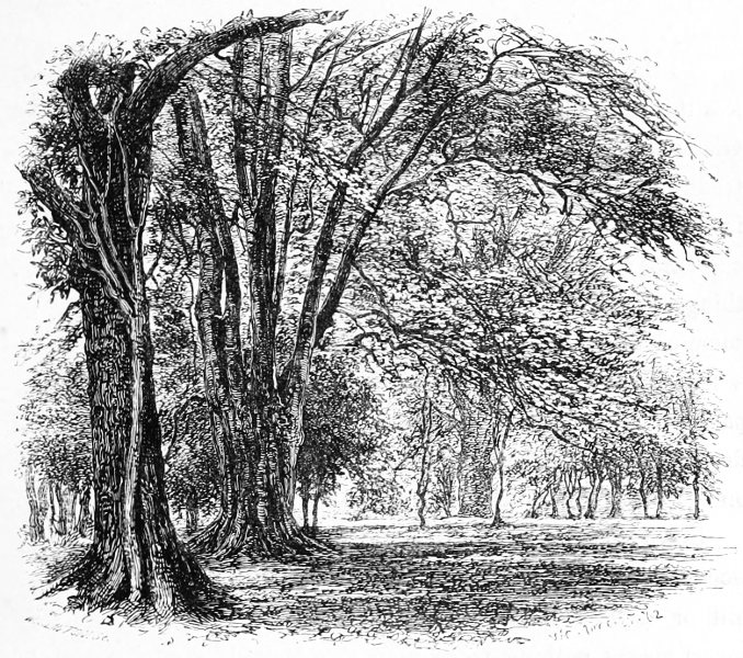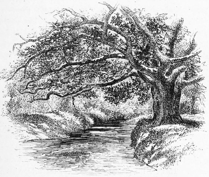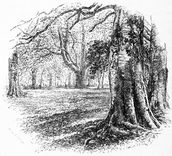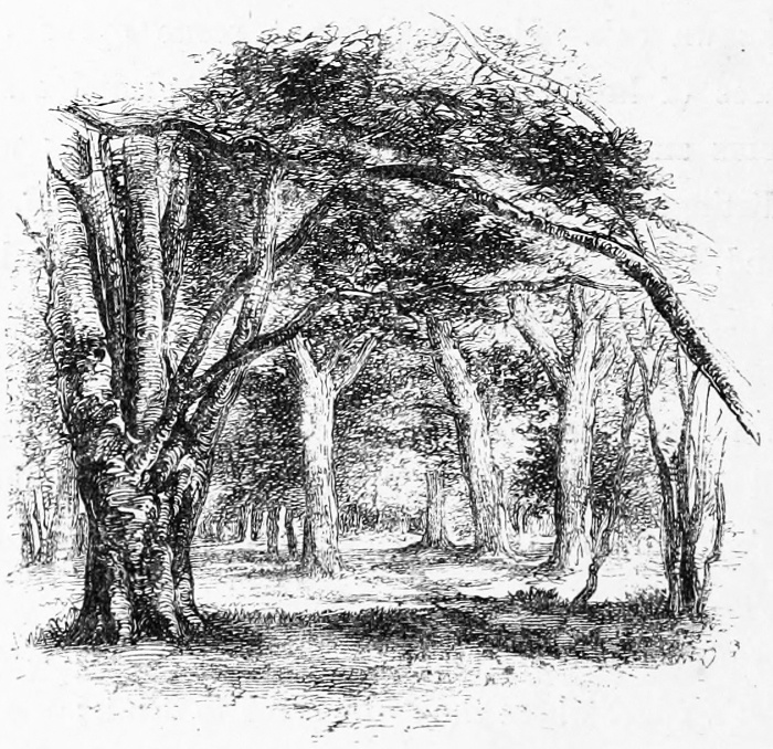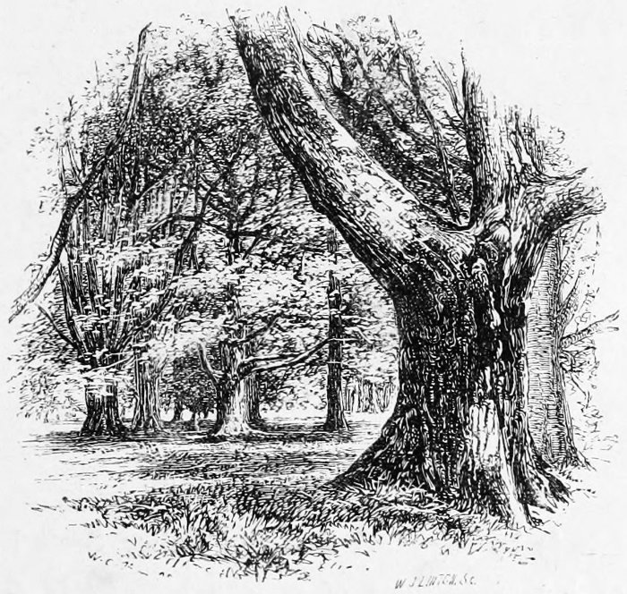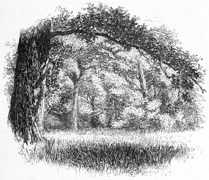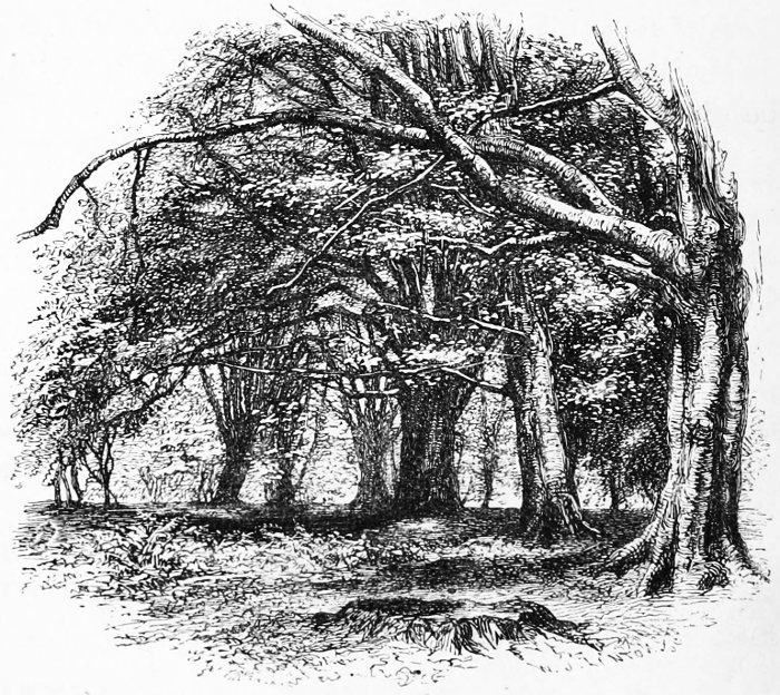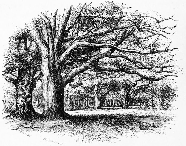 A few words, too, must be said about the two principal tree-forms which now make the Forest. The oaks here do not grow so high or so large as in many other parts of England, but they are far finer in their outlines, hanging in the distance as if rather suspended in the air than growing from the earth, but nearer, as especially at Bramble Hill, twisting their long arms, and interlacing each other into a thick roof. Now and then they take to straggling ways, running out, as with the famous Knyghtwood Oak, into mere awkward forks. The most striking are not, perhaps, so much those in their prime, as the old ruined trees at Boldrewood, their bark furrowed with age, their timber quite decayed, now only braced together by the clamps of ivy to which they once gave support and strength.[8]