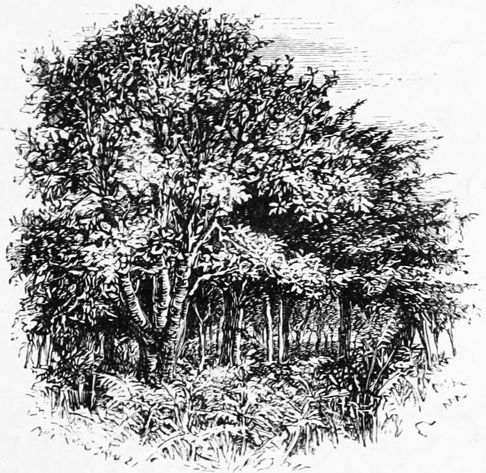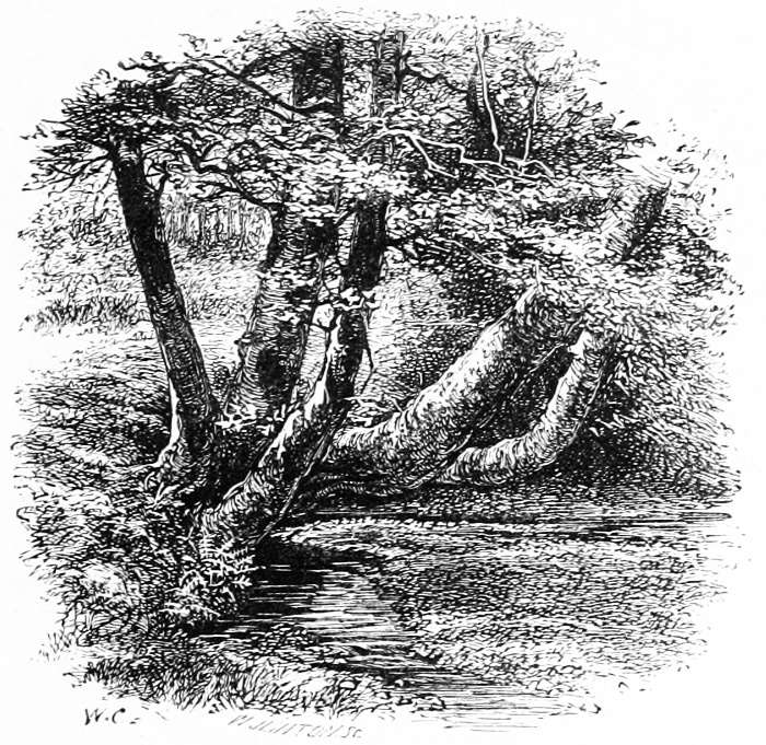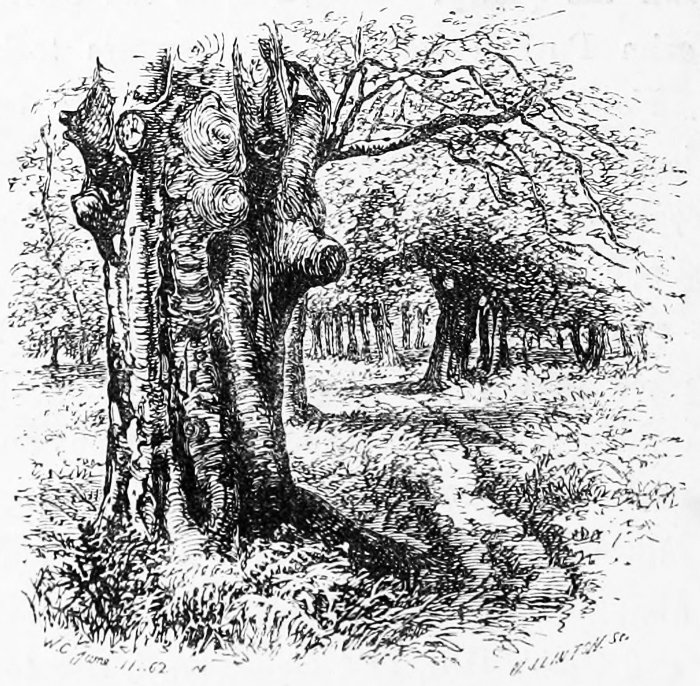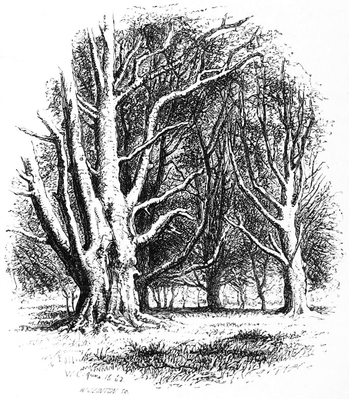 Consider, too, the loveliness of all tree-forms, from the birch and weeping-willow, which never know the slightest formality, even when in winter barest of leaves, to the oak with its sinewy 10 boughs, strained and tortured as they are in this very Forest, as nowhere else in England, by the Channel winds.[3] Consider, too, Nature’s own love and tenderness for her trees,—how, when they have grown old and are going to decay, she clothes them with fresh beauty, hides their deformities with a soft green veil of moss and the grey dyes of lichens, and, not even content with this, makes them the support for still greater loveliness—drapes them with masses of ivy, and hangs upon them the tresses of the woodbine, loading them to the end of their days with sweetness and beauty.
