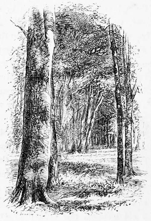 But not in individual trees lies the beauty of the Forest, but in the masses of wood. There, in the long aisles, settles that depth of shade which no pencil can give, and that colouring which no canvas can retain, as the sunlight pierces through the green web of leaves, flinging, as it sets, a crown of gold round each tree-trunk.