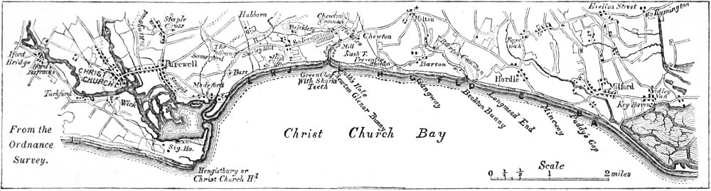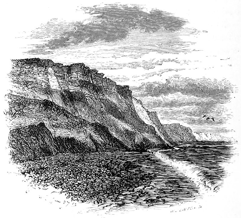 The same sea, too, still heaves and tosses beneath the Hordle and Barton Cliffs, with the same dark patches, shadows of clouds, sailing over it, as its waves, along the shore, unroll their long scrolls of foam.