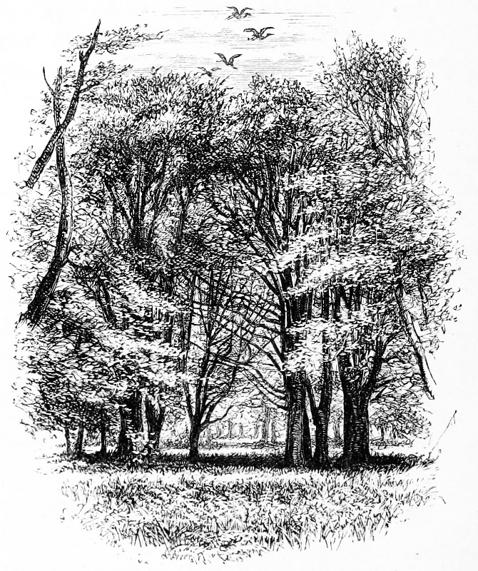 For all these things is it that the woods have been, since the beginning of the world, the haunt of the flowers, the home of the birds, and the temple of man. The haunt of the flowers, 9 I say, for in the early spring, before the grass is yet green in the meadows, here they all flock—white wood-anemones, sweet primroses, sweeter violets, and hyacinths encircling each stem with their blue wreaths. The home of the birds; for when the leaves at last have come, each tree is filled with song, and the underwood with the first faint chirping of the nestlings learning their earliest notes. As a temple for man, have they not been so since the world began? Taught by their tender beauty, and subdued by their solemn gloom, the imaginative Greek well consecrated each grove and wood to some Divinity. The early Christians fled to “the armour of the house of the Forest,” to escape to peace and quietness. Here the old Gothic builders first learnt how to rear their vaulted arches, and to wreathe their pillars with stone arabesques of leaves and flowers, in faint imitation of a beauty they might feel, but never reach.[2]
